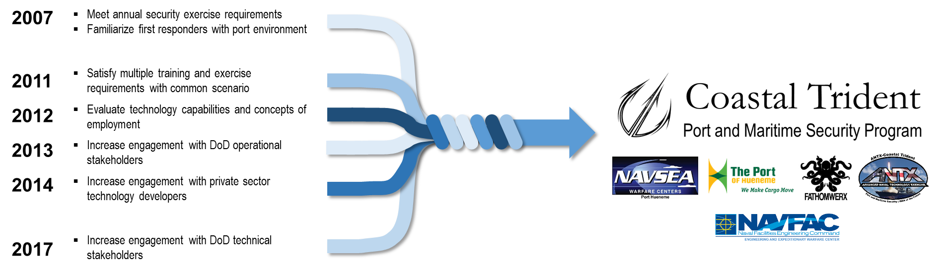Coastal Trident was established in 2007 as a training and exercise program for the Port of Hueneme. It was conducted to assist in familiarizing local law enforcement and emergency response partners with the complex jurisdictional authorities, operational and technical limitations, and logistics considerations associated with the response to a major incident at the Port. Since its inception, however, Coastal Trident has expanded significantly in scope and influence, developing into a broader program that serves to support innovative operational research and offers unique resources to meet training, field experimentation, and exercise priorities among stakeholders in port and maritime security. Today, Coastal Trident is a series of technical demonstrations, field experiments, discussion-based and operations-based exercises.